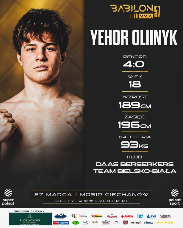 18-letni Yehor Oliinyk stanie przed kolejnym wyzwaniem w swojej zawodowej karierze. Zawodnik związany z Berserkers Team Bielsko-Biała stoczy 27 marca swoją piątą walkę podczas gali Babilon MMA 57, która odbędzie się w Ciechanowie.