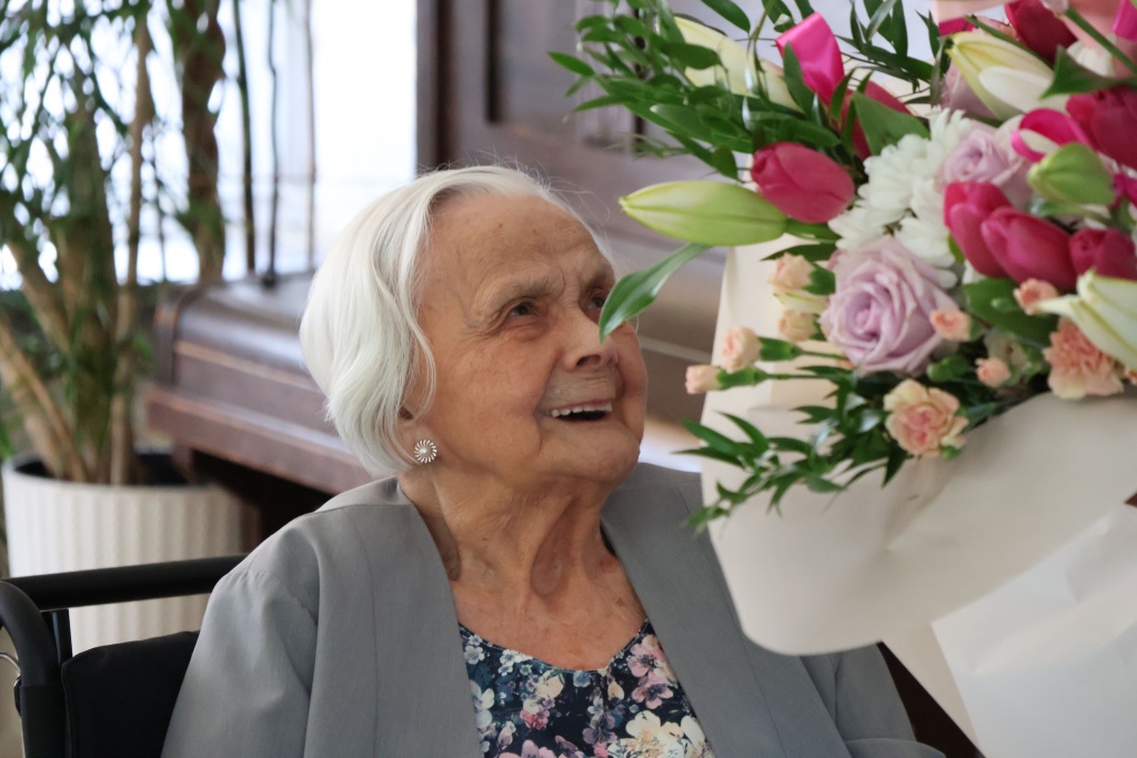 Urodzona w 1923 roku w Bielsku jubilatka z uśmiechem przyjmowała liczne bukiety kwiatów, prezenty oraz serdeczne życzenia zdrowia.