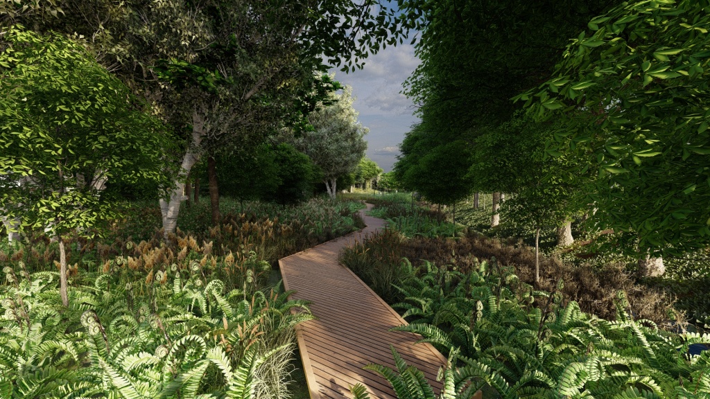 W parku zasadzonych zostanie 28 drzew oraz ponad 3.700 krzewów i bylin, znajdzie się tu też miejsce na założenie łąki kwietnej. Co do infrastruktury, powstanie drewniany podest prowadzący do zbiornika retencyjnego, odbudowana zostanie również faszynada potoku, czyli zabezpieczenie przed erozją umacniające skarpę i stabilizujące grunt, złożone z wiązek gałęzi, wikliny lub chrustu.