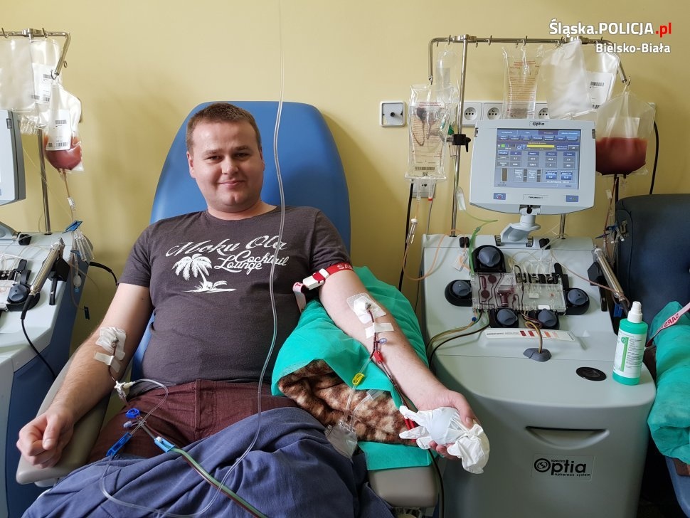 - „Jest kilka możliwości zarejestrowania się jako dawca. Ja zarejestrowałem się w październiku 2016 r. poprzez stronę internetową Fundacji DKMS Polska. Następnie otrzymałem pocztą do domu pakiet rejestracyjny, czyli formularz oraz pałeczki do pobrania wymazu z ust. Pakiet ten należy odesłać do siedziby fundacji, gdzie po przebadaniu przesłanych próbek i wprowadzeniu danych, stajemy się potencjalnym dawcą. W październiku 2017 r. (więc po upływie około roku od czasu rejestracji) skontaktował się ze mną konsultant Fundacji DKMS Polska przekazując informację, że zostałem wytypowany jako potencjalny dawca komórek macierzystych dla konkretnego pacjenta. Otrzymałem skierowanie na badania krwi do najbliższego dla mnie laboratorium, celem wykonania dokładniejszych badań genetycznych. Po kilku tygodniach otrzymałem kolejny telefon z informacją, że zgodność z pacjentem została potwierdzona i zostałem skierowany na kolejne badania. Jako metodę pobrania wybrano u mnie pobranie komórek macierzystych z krwi obwodowej. Zabieg miał miejsce w marcu 2018 r. w szpitalu w Krakowie i był bezbolesny. Wszystko trwało około 5 godzin, po czym mogłem opuścić szpital. Kilka godzin po zabiegu dowiedziałem się, że moje komórki pomogą chorej na białaczkę 45-letniej kobiecie z Polski. Obecnie czekam na informację, czy przeszczep się udał. Czuję się bardzo dobrze. Nie mam żadnych dolegliwości związanych z zabiegiem. Namawiam każdego, aby się zarejestrował. Od dnia zabiegu kilku moich znajomych również zarejestrowało się jako potencjalni dawcy. Mój przykład dowodzi, że ktoś czeka z nadzieją, a my możemy mu dać szansę na normalne życie” – mówi policjant.