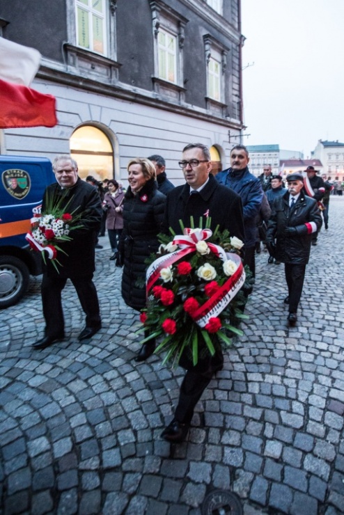 Za nim jednak marsz ruszył ulicami Bielska-Białej, zgromadzeni na Placu Opatrzności Bożej mieszkańcy odśpiewali Mazurka Dąbrowskiego i wysłuchali apelu poległych Narodowych Sił Zbrojnych. Następnie wśród patriotycznych okrzyków, kolumna marszowa ruszyła ulicą 11 listopada, zatrzymując się przy Placu Wojska Polskiego. Kilkuosobowa delegacja udała się złożyć kwiaty oraz znicze pod tablicą przy budynku byłej katowni Urzędu Bezpieczeństwa, przy ulicy Stojałowskiego. Następnie kolumna ruszyła dalej w stronę placu Chrobrego, oraz ulicy Krasińskiego.